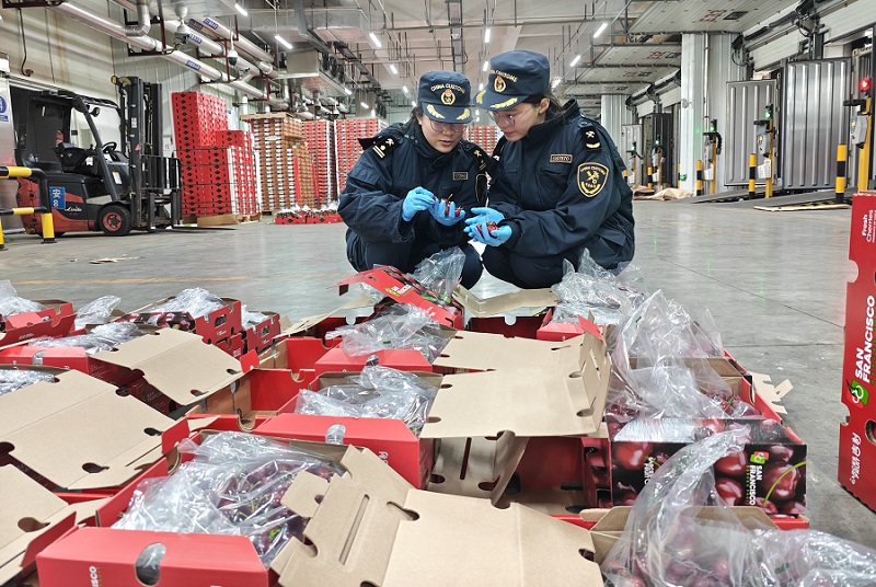 圖為:關員對廣州南沙口岸2026年首批進口車厘子進行監管關悅/攝